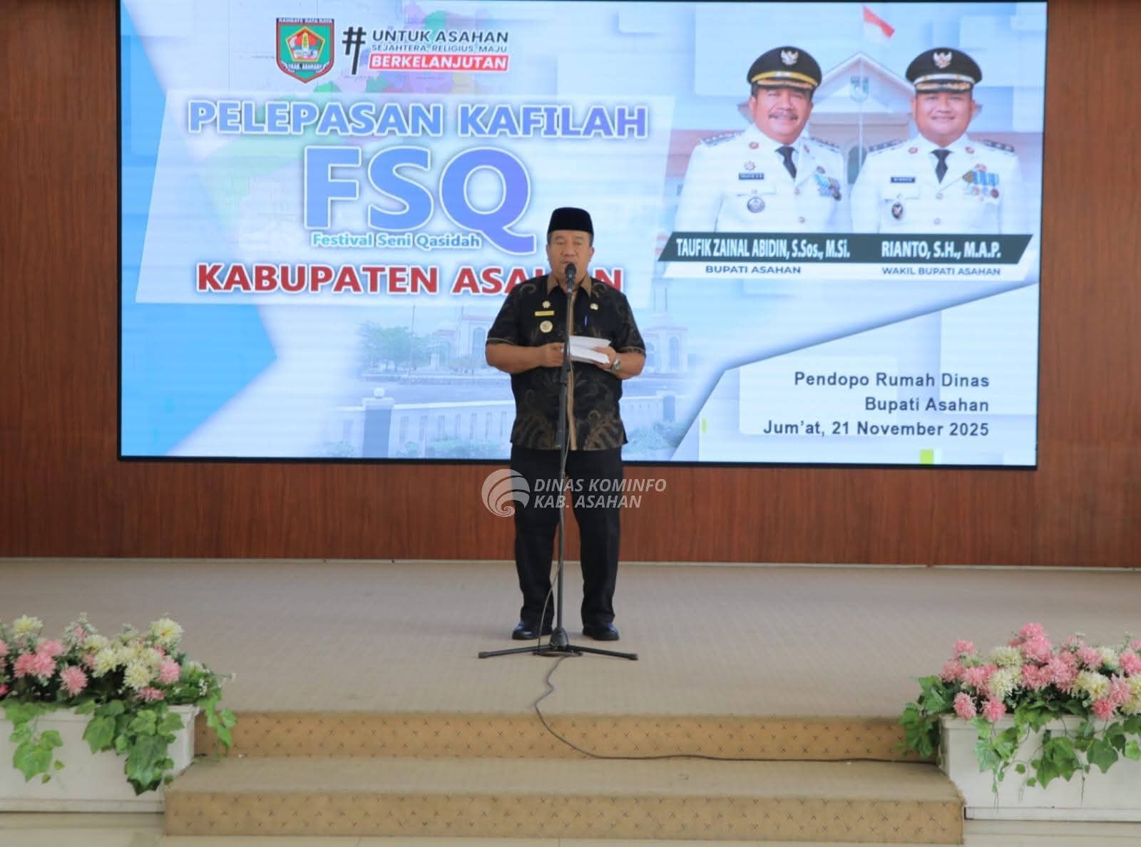 Kisaran, Sergap24jam. Com Kontingen Festival Seni Qasidah (FSQ) Kabupaten Asahan resmi dilepas untuk mengikuti ajang tingkat Provinsi Sumatera Utara. Pelepasan berlangsung di Aula Pendopo Rumah Dinas Bupati Asahan, diawali dengan laporan kesiapan oleh Ketua Umum LASQI Kabupaten Asahan, Drs. Daman Huri Lubis, M.Pd., yang menjelaskan bahwa festival akan digelar pada 23–28 November 2025 di UPT Asrama Haji Medan.(21.11.2025)