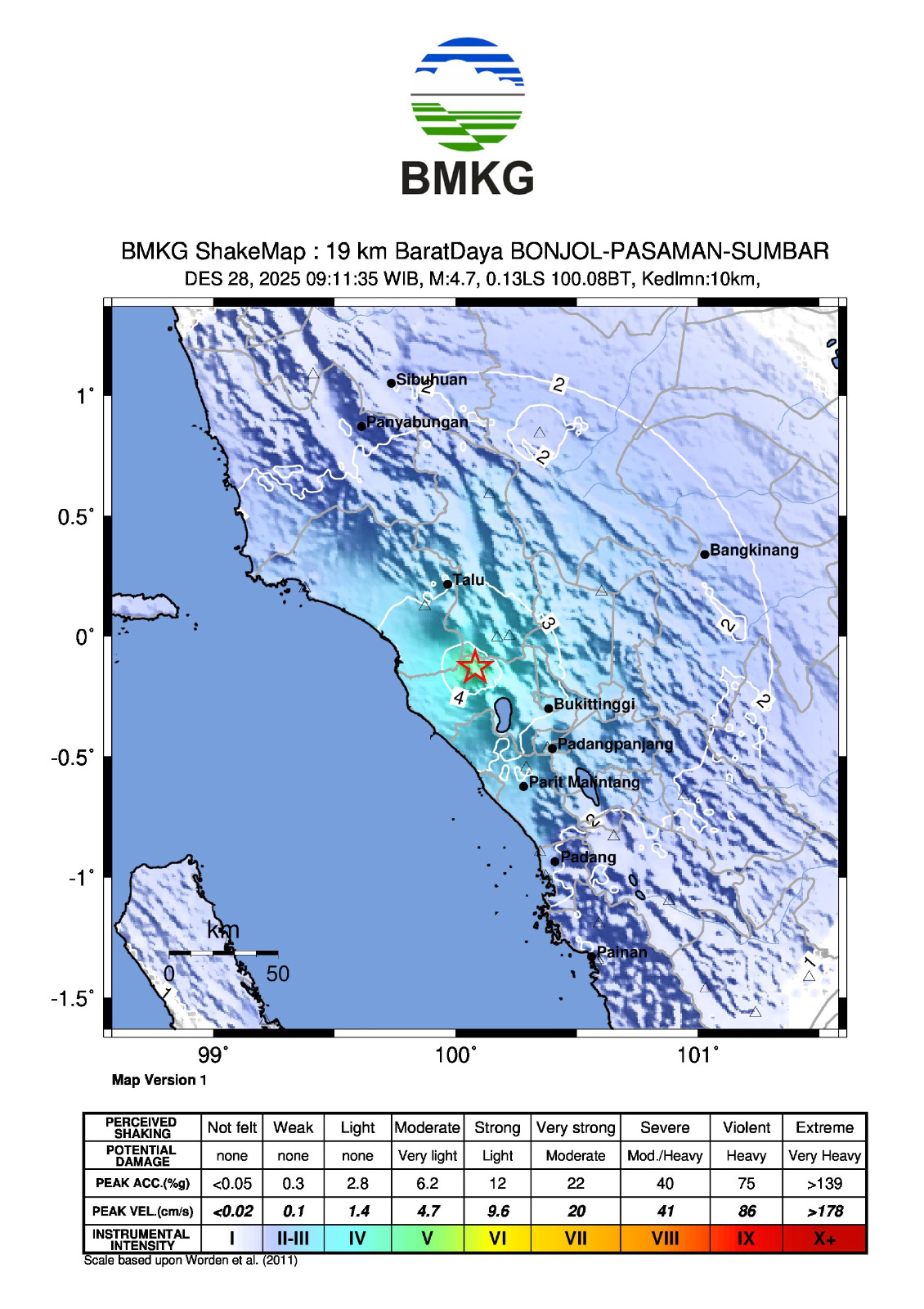Hari Minggu, 28 Desember 2025 pukul 09:11:35 WIB wilayah Bonjol, Pasaman, Sumbar diguncang gempa tektonik. Hasil analisis BMKG menunjukkan gempabumi ini memiliki parameter dengan magnitudo M4.7. Episenter gempabumi terletak pada koordinat 0.13° LS ; 100.08° BT, atau tepatnya berlokasi di darat pada jarak 19 km BaratDaya BONJOL-PASAMAN-SUMBAR pada kedalaman 10 km.