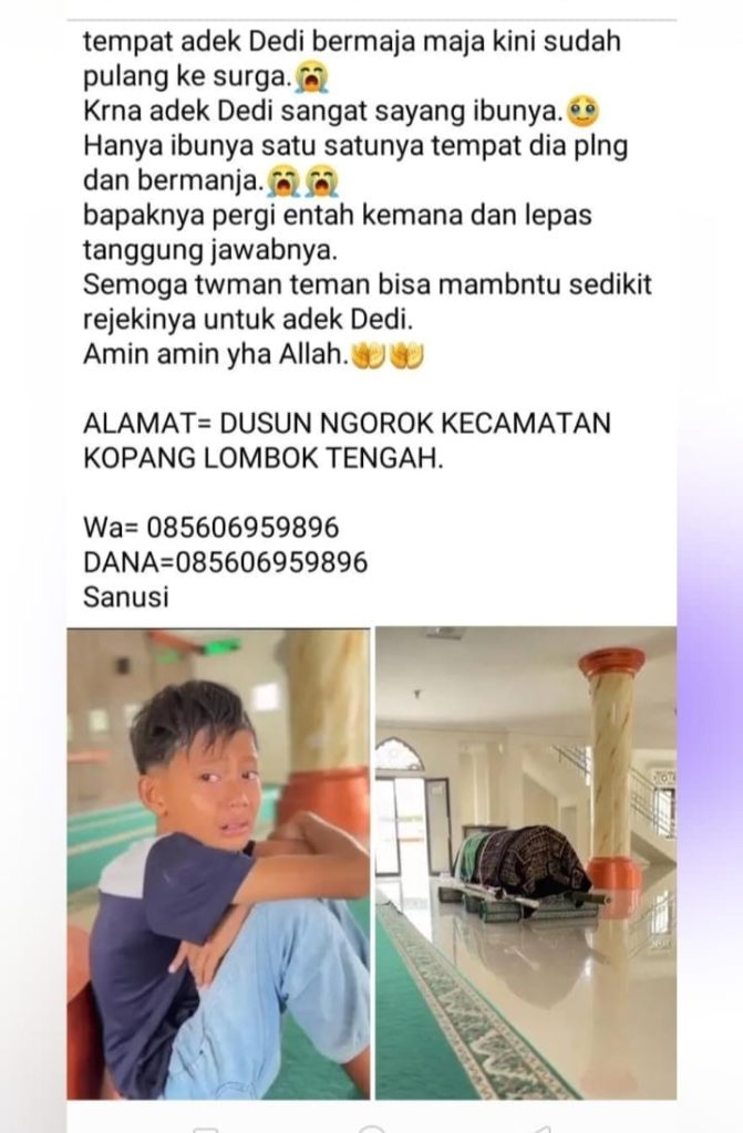 Lombok Tengah, 26 Maret 2026 – Duka mendalam menyelimuti Dusun Ngorok, Kecamatan Kopang, Kabupaten Lombok Tengah. Seorang ibu dari anak bernama Dedi dikabarkan telah meninggal dunia, meninggalkan kesedihan yang mendalam bagi keluarga.