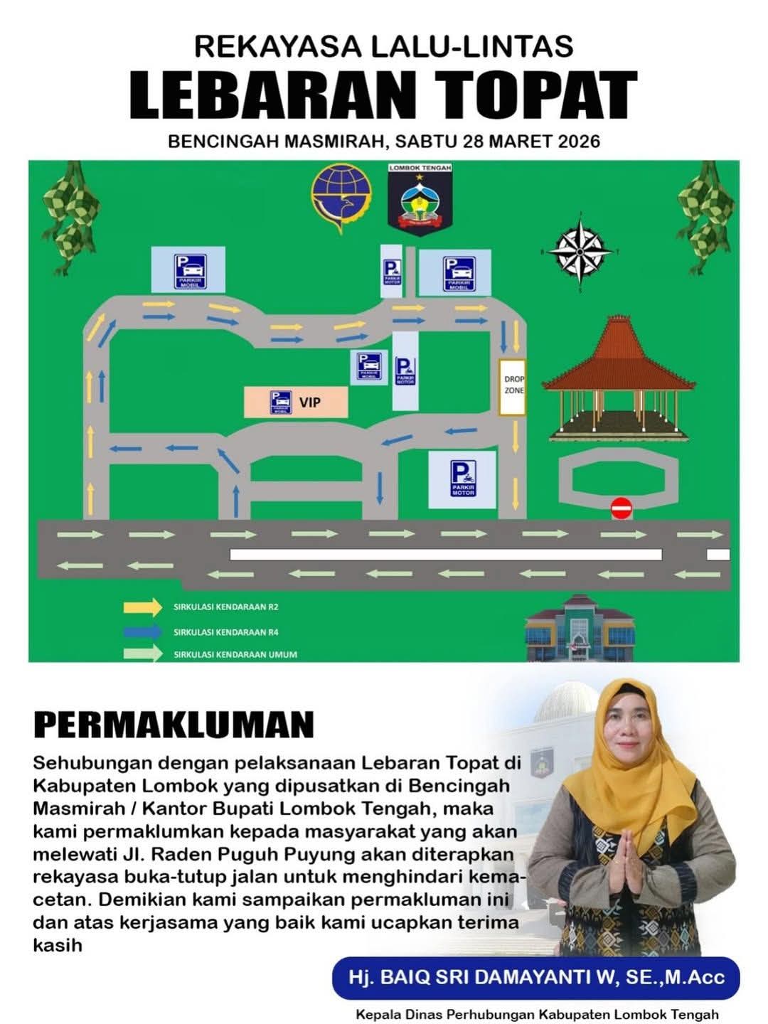 Lombok Tengah, NTB// Sergap24jam. Com. Lebaran Topat 2026 di wilayah Kabupaten Lombok Tengah akan dipusatkan di kawasan Bencingah Masmirah pada Sabtu, 28 Maret 2026. Untuk mendukung kelancaran kegiatan serta mengantisipasi kepadatan arus kendaraan, pemerintah daerah melalui Dinas Perhubungan menyiapkan rekayasa lalu lintas di sejumlah titik strategis.