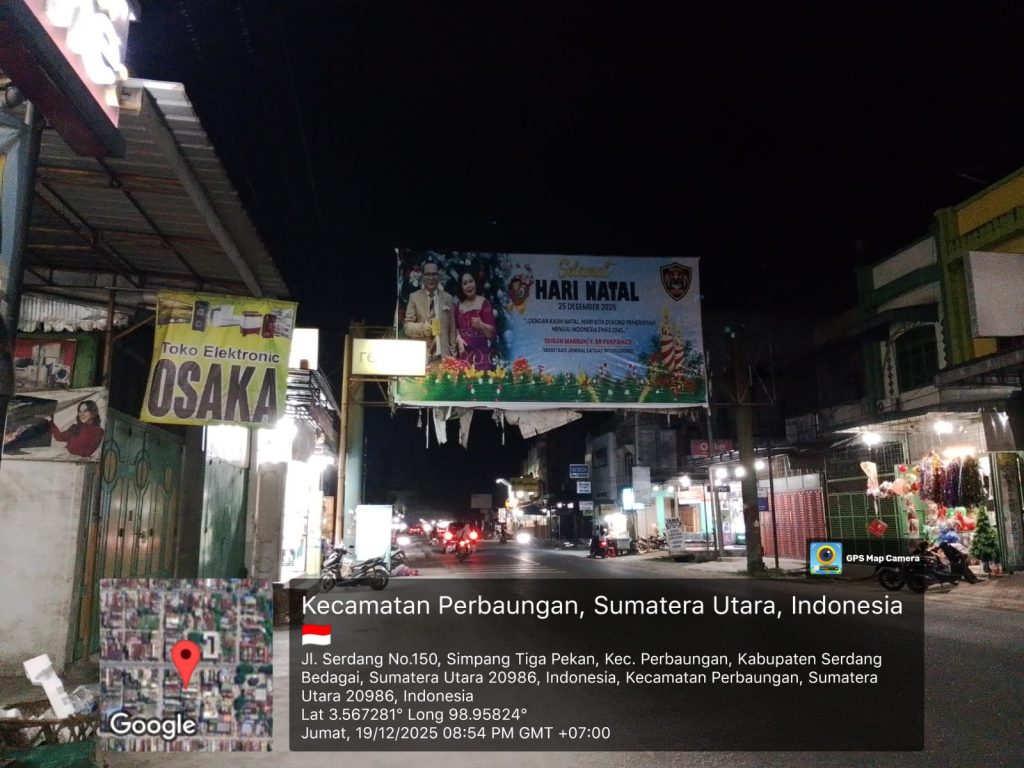 Ucapan tersebut disampaikan melalui sebuah baliho besar yang terpampang di Jalan Lintas Sumatera, tepatnya di Jalan Sudirman No. 101, Sei Rampah, Kecamatan Sei Rampah, Kabupaten Serdang Bedagai, Provinsi Sumatera Utara, pada Sabtu (20/12/2025).